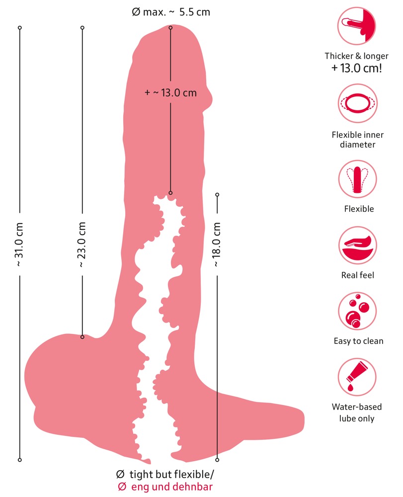 Le pénis s’insère facilement dans le godemiché naturel creux et extensible ou dans le vagin. À l’intérieur étroit, des structures de stimulation authentiques stimulent à chaque poussée. Le godemiché peut également être utilisé pour remplir profondément le pénis de son ou sa partenaire – le pénis est allongé de 13 cm et sensiblement épaissi. Bien entendu, le godemiché naturel flexible peut aussi être utilisé seul. Une stimulation intense et des possibilités d’utilisation flexibles s’unissent pour un maximum de plaisir.