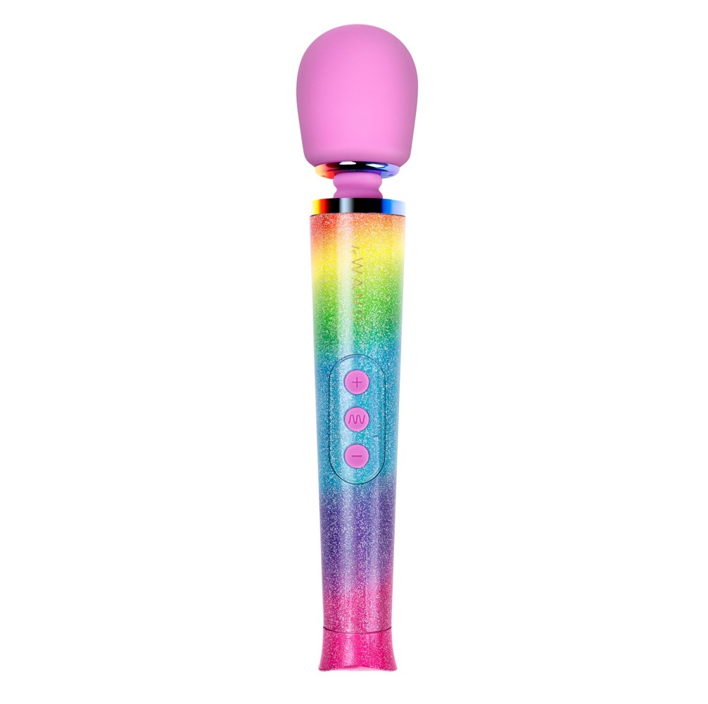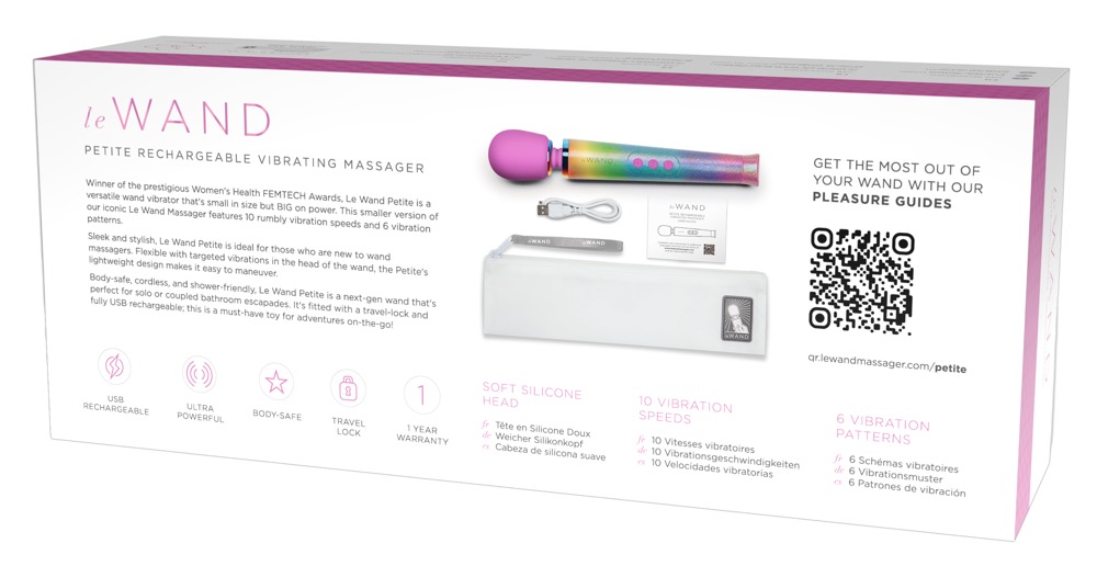Bâton de massage de luxe rechargeable Petite Rechargeable Vibrating Massager All That Glimmers de le WAND pour des massages intenses en solo ou en couple. Sauvage, coloré et créatif – l’édition spéciale aux couleurs scintillantes de l’arc-en-ciel ! 6 modes de vibration en 10 intensités assurent un plaisir de massage individuel et polyvalent et sont facilement contrôlables grâce à la commande à 3 boutons sur la poignée. Même dans le bain et la douche, car le bâton de massage est étanche. De plus, il est équipé d’un verrouillage pratique des touches pour un transport et un rangement discrets.