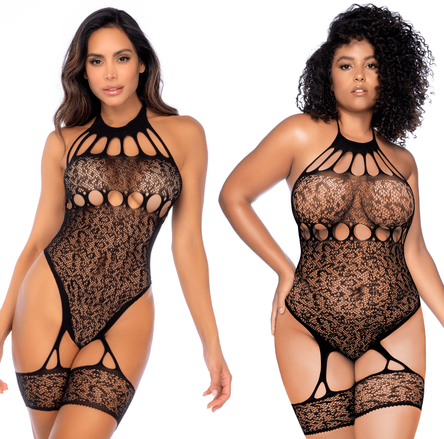 Entièrement réalisé en résille noire à imprimé léopard, il se distingue par une encolure tour de cou ouverte et une résille transparente offrant un rendu audacieux et assumé. De larges bandes façon jarretières, intégrées au design, encadrent les hanches et allongent visuellement les jambes, structurant la silhouette avec élégance.