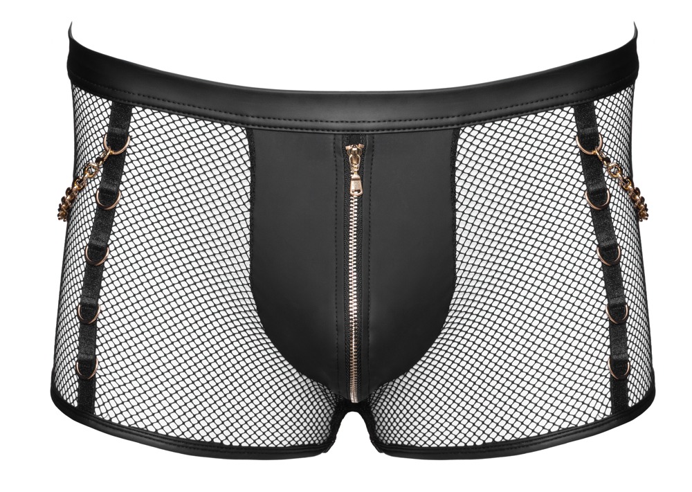 Pants noirs de Svenjoyment en matière résille pour se montrer, mélangés à un wetlook branché. Avec fermeture éclair dans une poche opaque. Élastique sur tout le pourtour et doux au toucher pour un grand confort. Anneaux décoratifs dorés sur les côtés et à l’arrière de la ceinture. Les deux chaînes à mousquetons dorées sont amovibles.