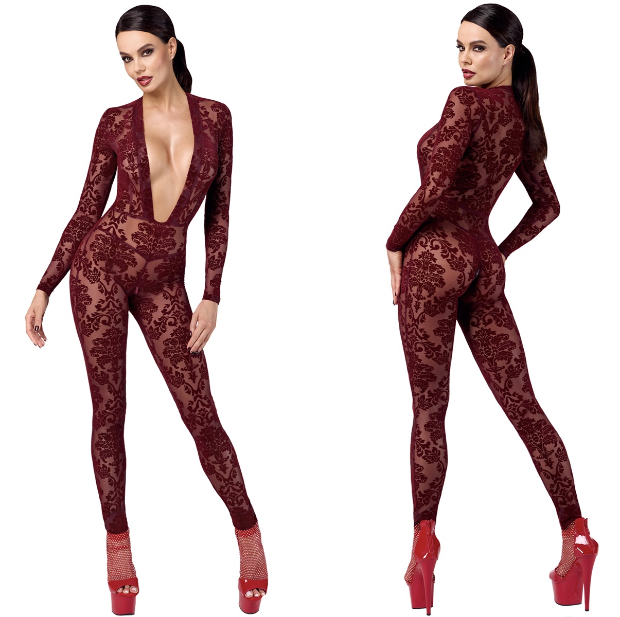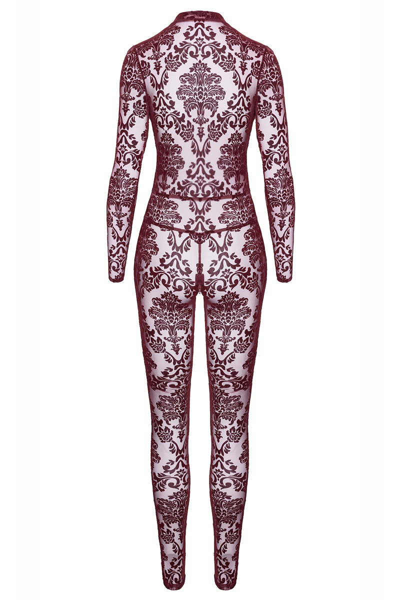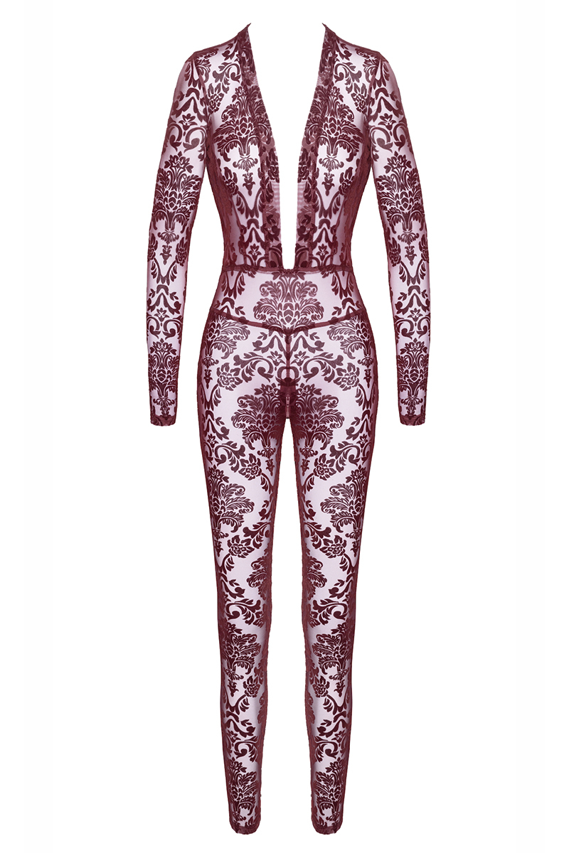 La marque Noir Handmade présente la combinaison en tulle floqué Kink Royal F382, une luxueuse combinaison à manches longues avec décolleté plongeant, fabriquée en tulle transparente bordeaux.