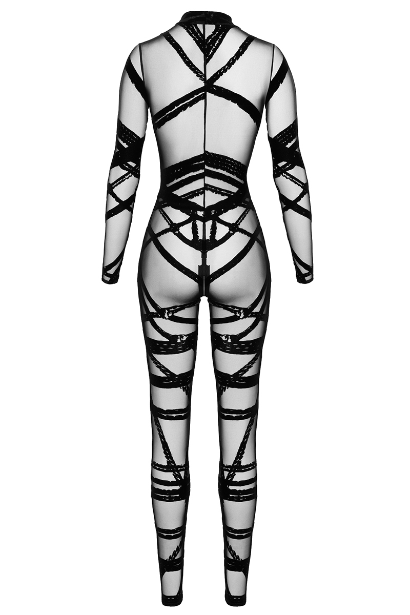 La marque Noir Handmade présente la combinaison Bondesque F373, une Combinaison noire, semi-transparente, en tulle extensible floqué, style bondage.