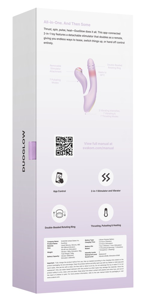 Le DuoGlow de SVAKOM combine un vibromasseur à perles et un stimulateur à pulsations dans un design unique en deux parties. Le vibromasseur et le stimulateur amovible (télécommande) peuvent être utilisés de manière polyvalente lors de jeux intimes – seul ou à deux. Soit en tant que jouet combiné pour une stimulation vaginale et clitoridienne simultanée. Ou séparément, le stimulateur à pulsations pouvant également être utilisé comme télécommande autonome pour le vibromasseur.
