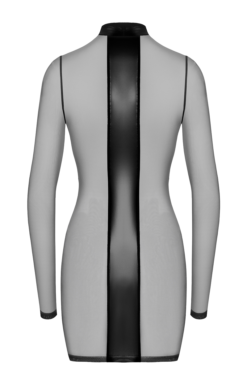 La marque Noir Handmade présente la mini robe Crossfire F369, une robe noire courte et moulante à manches longues, confectionnée en powerwetlook et tulle extensibles, une association de matières opaques et transparentes.