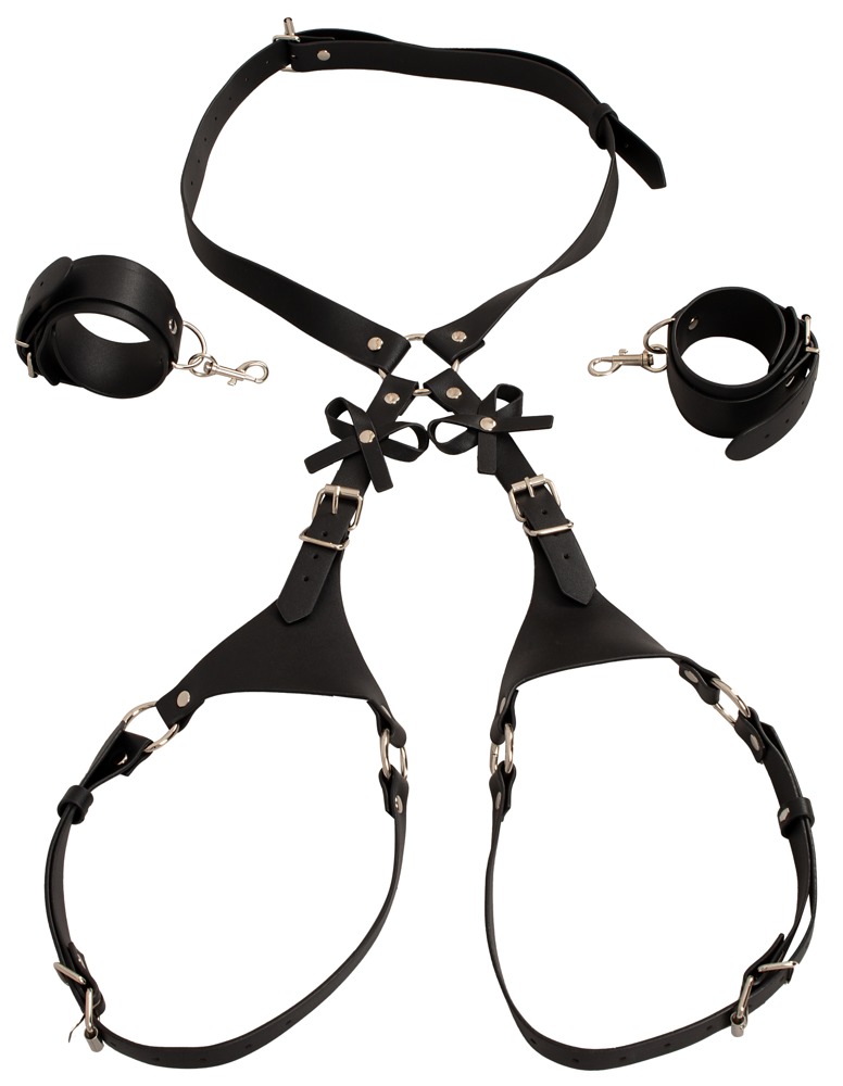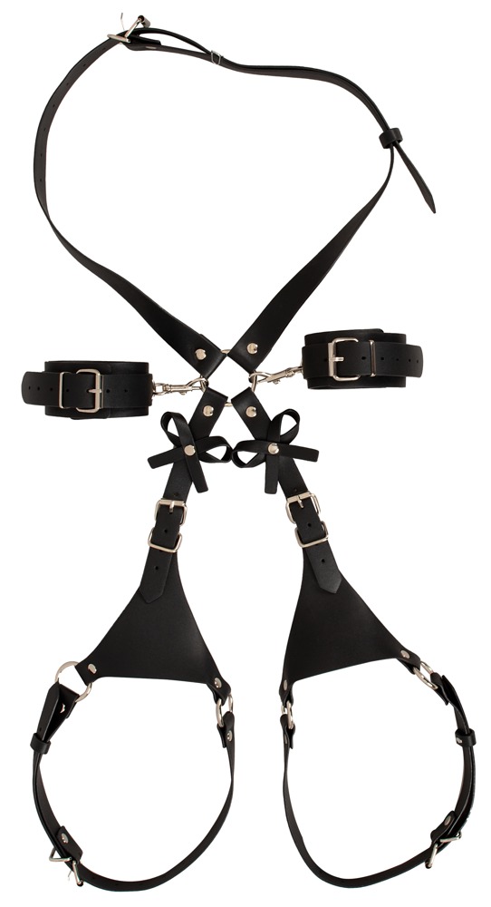 Harnais extravagant avec manchettes de Bad Kitty en similicuir noir élégant, travaillé avec soin avec des rivets et des anneaux de couleur argentée. Le harnais de hanche avec sangles de cuisses est réglable de multiples façons grâce à des fermetures à boucles, de sorte que tout soit parfaitement ajusté. Les deux lanières avec des noeuds fantaisie peuvent être portées aussi bien devant que derrière. Les deux menottes souples s’adaptent parfaitement grâce à leurs boucles de fermeture réglables et s’accrochent rapidement au harnais grâce à leurs mousquetons.