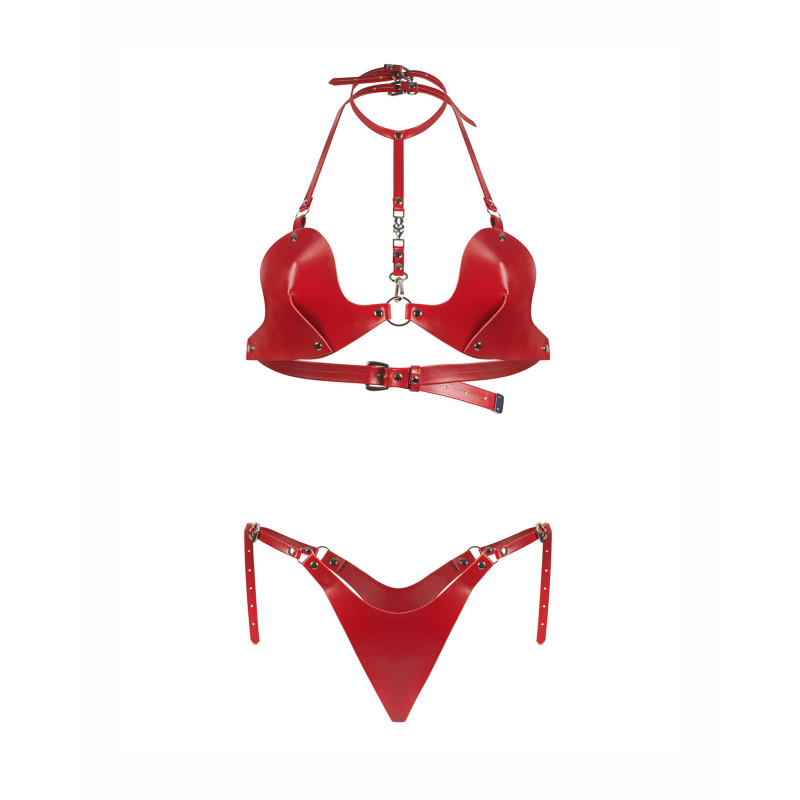 Un ensemble deux pièces composé d’un soutien-gorge et d’un string dans un design géométrique audacieux. Les bonnets structurés créent un effet époustouflant, tandis que la sangle allant du cou à la taille ajoute du caractère. Le string taille haute s’enroule autour des hanches et accentue la silhouette.