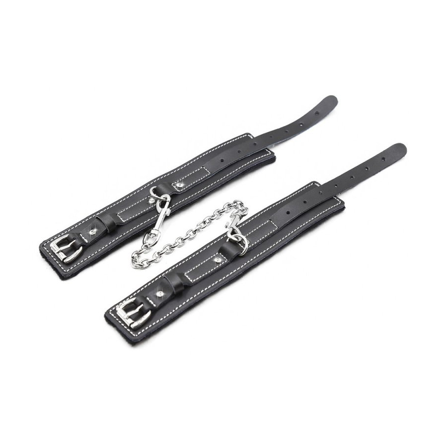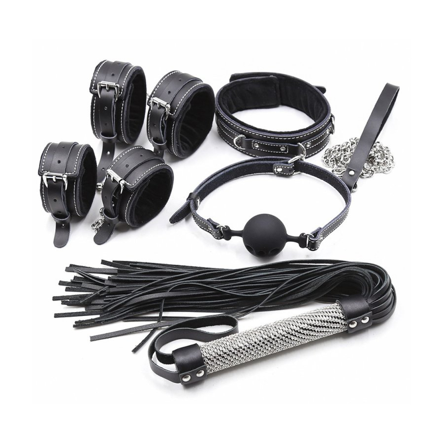 Kit avec un martinet, un bâillon-boule, un collier-laisse, des menottes de chevilles et des menottes de poignets.