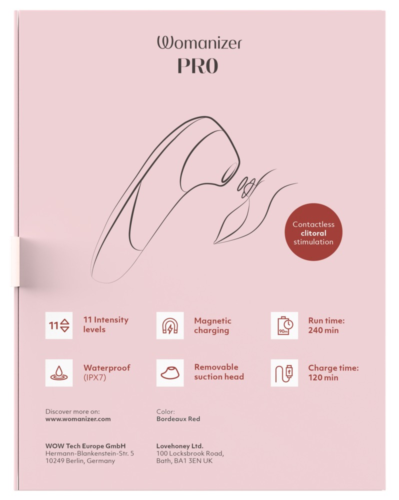 Pulsateur Pro silencieux de Womanizer avec la technologie éprouvée Pleasure Air en 11 niveaux d’intensité. De taille compacte et facile à utiliser – idéal pour les débutants en Womanizer. Comme tous les Womanizer, le Pro entoure le clitoris sans le toucher et le stimule par de douces vibrations d’air – sans effet d’accoutumance ni sensation désagréable de surexcitation. Pour des orgasmes multiples et des moments forts en quelques minutes ! De plus, il est étanche pour le plaisir dans le bain et la douche.