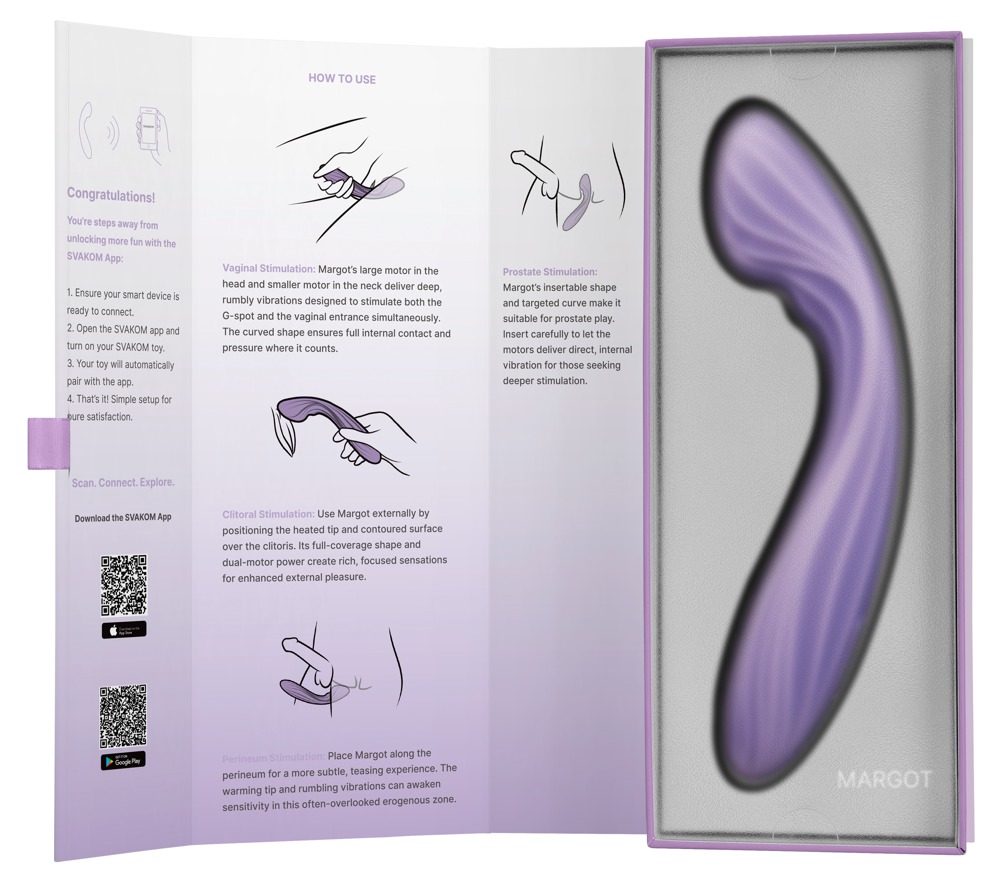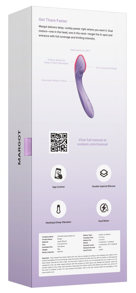 App-Controlled Dual Motor G-Spot Vibrator Margot de SVAKOM. Ergonomiquement parfaitement courbé et avec une tête aplatie pour une stimulation ciblée des points de plaisir à l’intérieur et à l’extérieur du corps. La zone G et le clitoris en particulier se réjouissent d’un massage intensif ! De douces structures ondulées intensifient encore le contact. Doux et soyeux, le vibromasseur en silicone à double couche glisse comme par magie sur la peau et dans les profondeurs intimes. Il suffit d’appuyer sur un bouton pour qu’il offre une grande variété de vibrations. Ce poids plume stylé s’intègre facilement dans tous les jeux en solo et les jeux amoureux. Même dans le bain et la douche, car Margot est étanche.