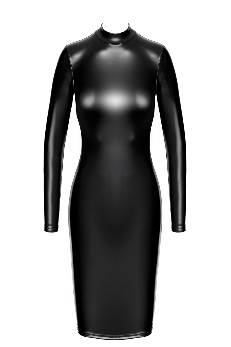 La marque Noir Handmade présente la robe fuseau Crystal F371, une robe noire mi-longue extensible, confectionnée en powerwetlook et tulle, une association de matières opaques et transparentes.