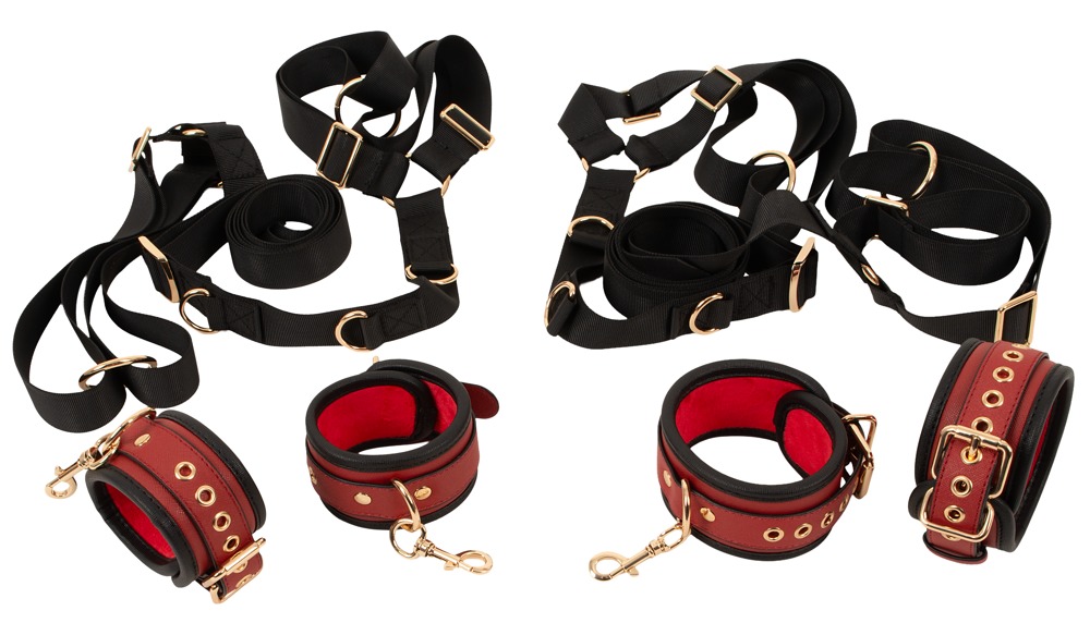 set de 5 pièces : 1 croix de ceinture, 2 menottes pour les mains, 2 menottes pour les pieds.