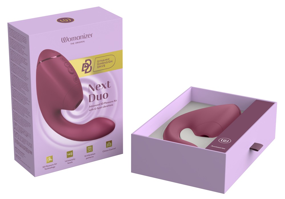 Le Womanizer Next Duo combine la technologie révolutionnaire 3D Pleasure Air pour le clitoris avec une puissante stimulation du point G – maintenant encore plus intense grâce au nouveau Dynamic Dimension Drive ! Ce double stimulateur presque silencieux (37 dB) offre un tout nouveau niveau d’orgasmes mixtes : les vibrations du point G et la stimulation pulsatile du clitoris fusionnent en une expérience unique et profonde qui rend les orgasmes volumineux et durables. Pour des moments de plaisir intenses et individuels qui pénètrent profondément dans la peau et qui durent longtemps.